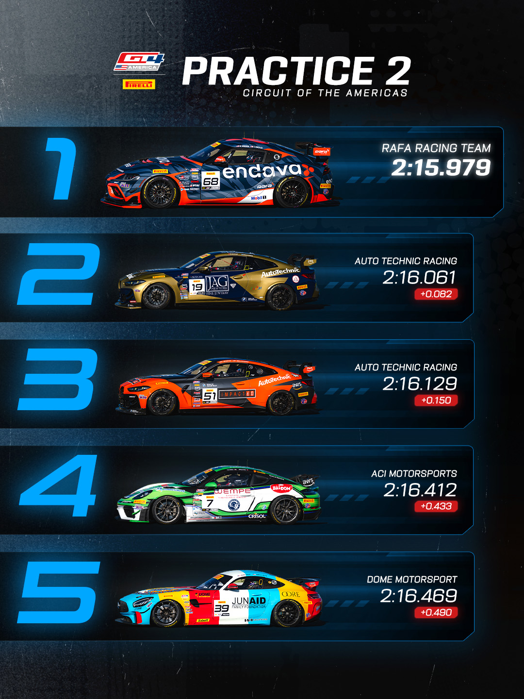 The Friday action at Circuit of The Americas concluded with Practice 2 in Pirelli GT4 America, with a full field of machinery setting off into the sunset to perfect their setups ahead of tomorrow's Qualifying sessions and the three-hour Lone Star Enduro. RAFA Racing Team asserted their dominance yet again, with the Silver class pairing of Tyler Gonzalez and Westin Workman going quickest again in the No. 68 Toyota Gazoo Racing GR Supra GT4 EVO2. Second overall and first in the Pro-Am category was occupied by the No. 19 Auto Technic Racing BMW M4 GT4 (G82) EVO of Roland Krainz and Stevan McAleer, with the sister Silver class Auto Technic Racing entry of Francis Selldorff and Kevin Boehm in the No. 51 BMW M4 GT4 (G82) EVO claiming third overall. The quickest AM class car was the No. 36 BimmerWorld BMW M4 GT4 (G82) EVO of James Walker Jr. and James Clay.